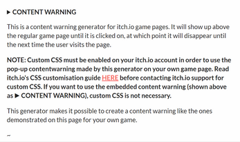 NOTE: Custom CSS must be enabled on your itch.io account in order to use the pop-up content warning made by this generator on your own game page. Read itch.io's CSS customisation guide HERE before contacting itch.io support for custom CSS. If you want to use the embedded content warning (shown above as ▶ CONTENT WARNING), custom CSS is not necessary.