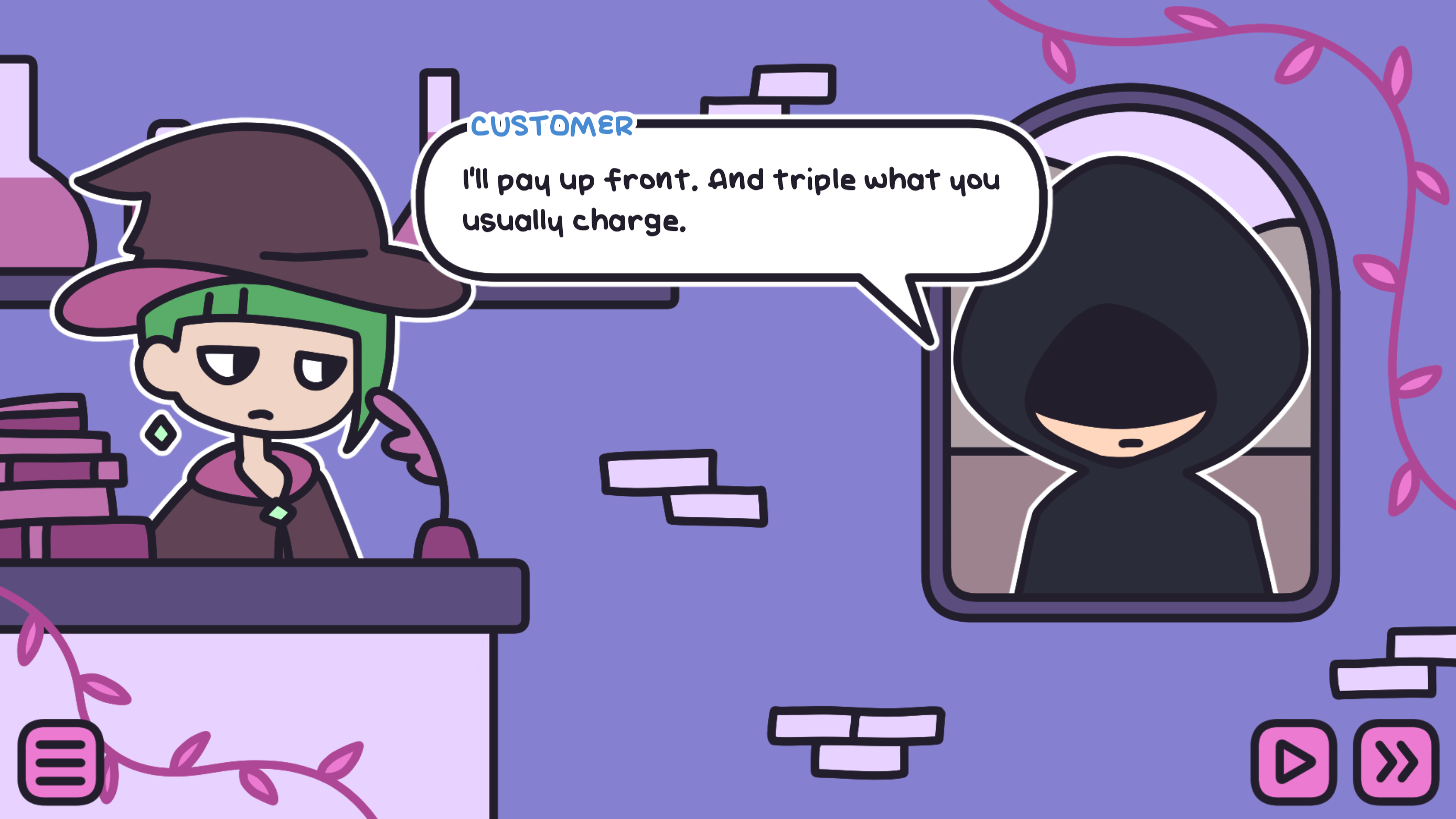 Figure out the right combination of words to cast a curse that matches your customer's needs! (Or don't - how you cast your curses is up to you!)